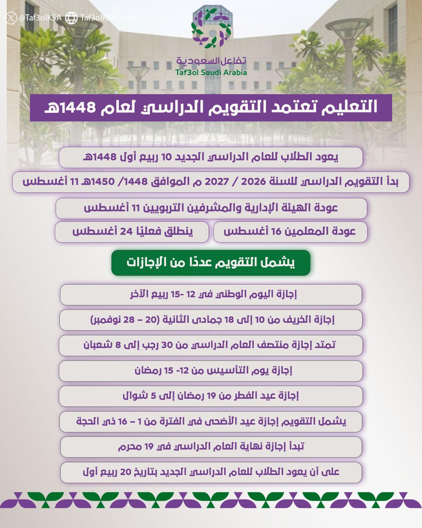 The Saudi Tafa'ul website presents an infographic featuring the most important dates announced by the Ministry of Education for the academic calendar for the year 1448 AH.